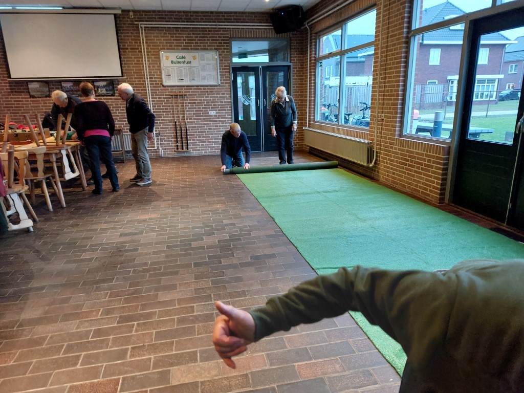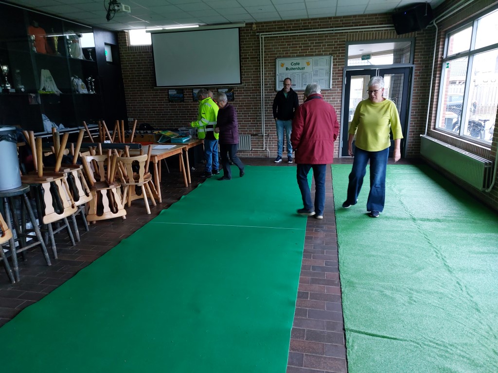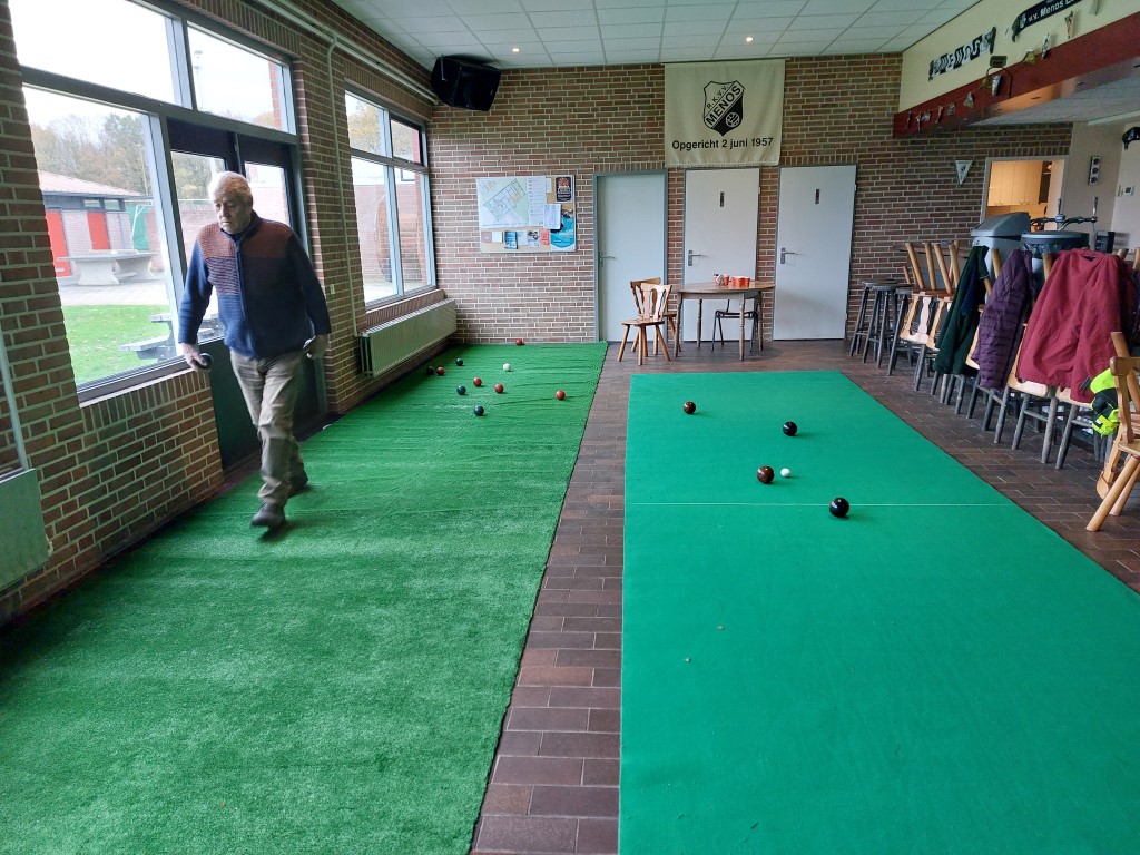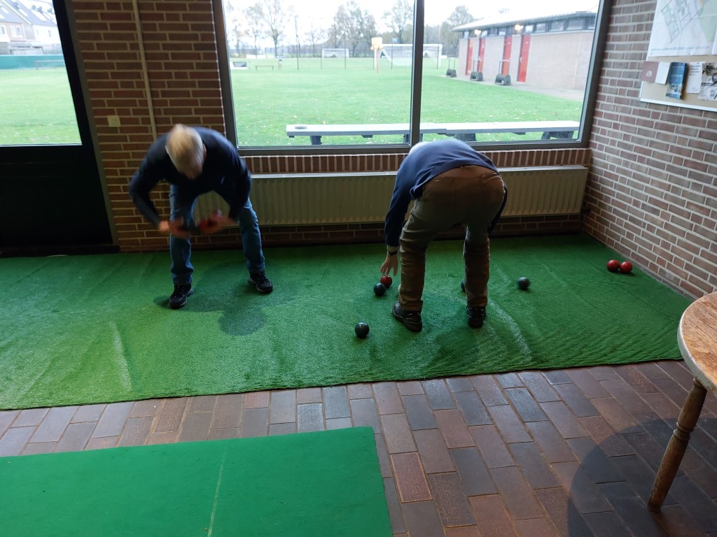 Voor het Jeu de Boulen en het Koersballen werd een oplossing gevonden in de kantine van Menos. De matten werden naar de kantine gebracht en op woensdag 19-11-2025 te 14.00u konden de spelers aan de gang. Allereerst moest er plaats gemaakt worden, tafels en stoelen opzij, en de matten uitrollen. De ruimte voor de Jeu de Boules mat is erg krap. Maar met wat goede wil is het wel te doen.
