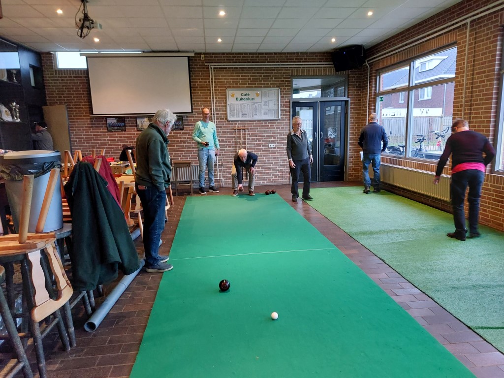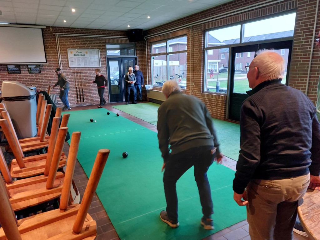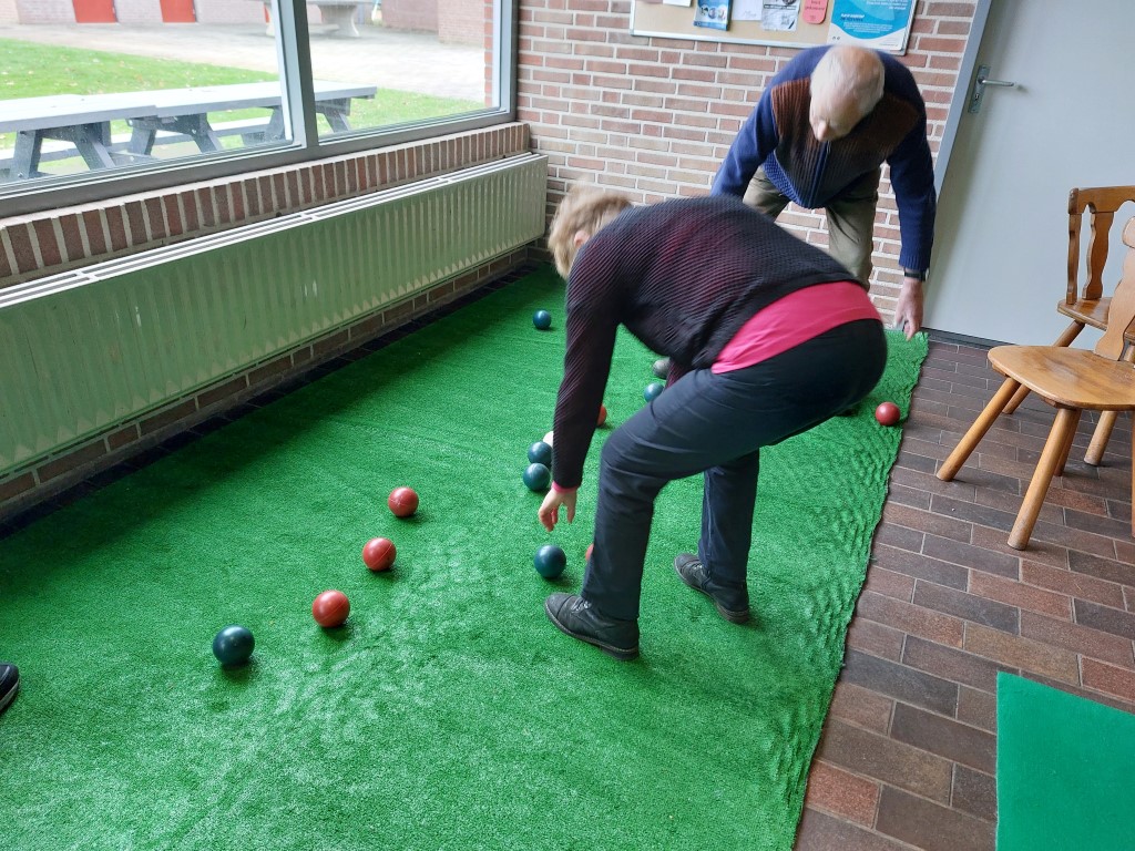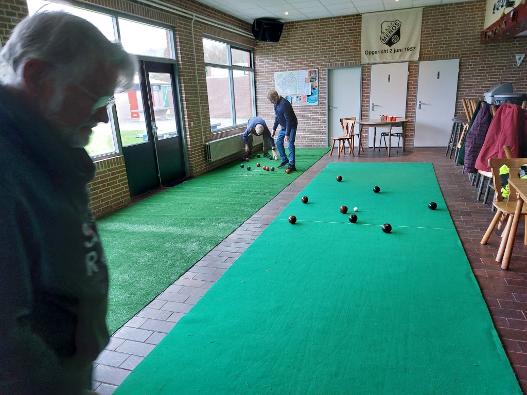 Voor het Jeu de Boulen en het Koersballen werd een oplossing gevonden in de kantine van Menos. De matten werden naar de kantine gebracht en op woensdag 19-11-2025 te 14.00u konden de spelers aan de gang. Allereerst moest er plaats gemaakt worden, tafels en stoelen opzij, en de matten uitrollen. De ruimte voor de Jeu de Boules mat is erg krap. Maar met wat goede wil is het wel te doen.