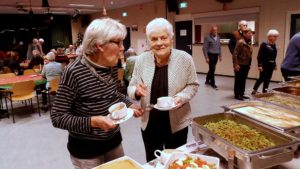 Maar toen deze was gearriveerd en de spijzen waren “uitgestald” konden we “aan tafel”. Soep, warm en koud gevolgd door bavarois! Het was allemaal even lekker! Compliment aan de cateraar. (van Vonderen)